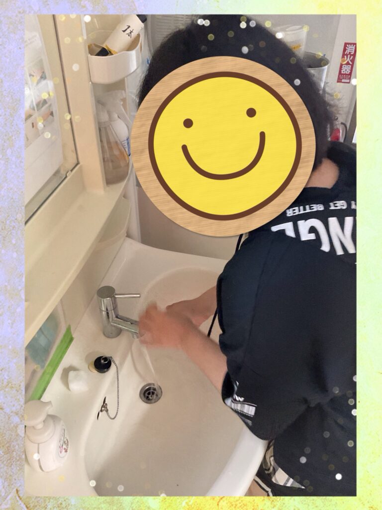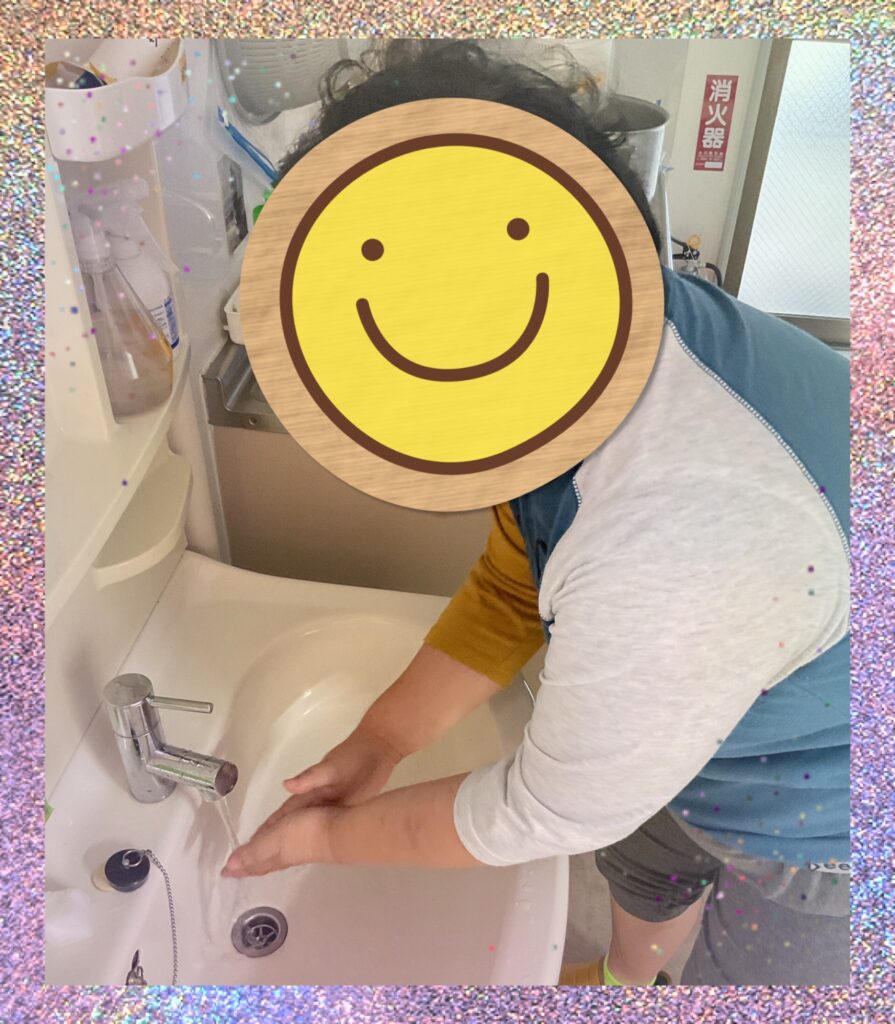1人だけで手洗いが難しい方は、スタッフと一緒に行いました。