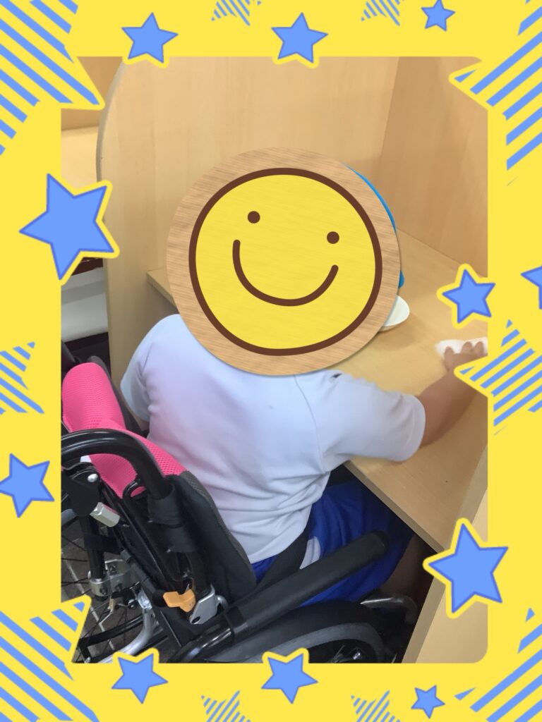 最後に机拭きの様子です。消毒を馴染ませたキッチンペーパーで隅から隅まで丁寧に拭く事が出来ましたね。