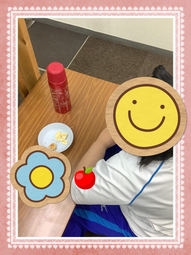 おやつの様子です。いただきますをしてからみんなで食べる事が出来ました。