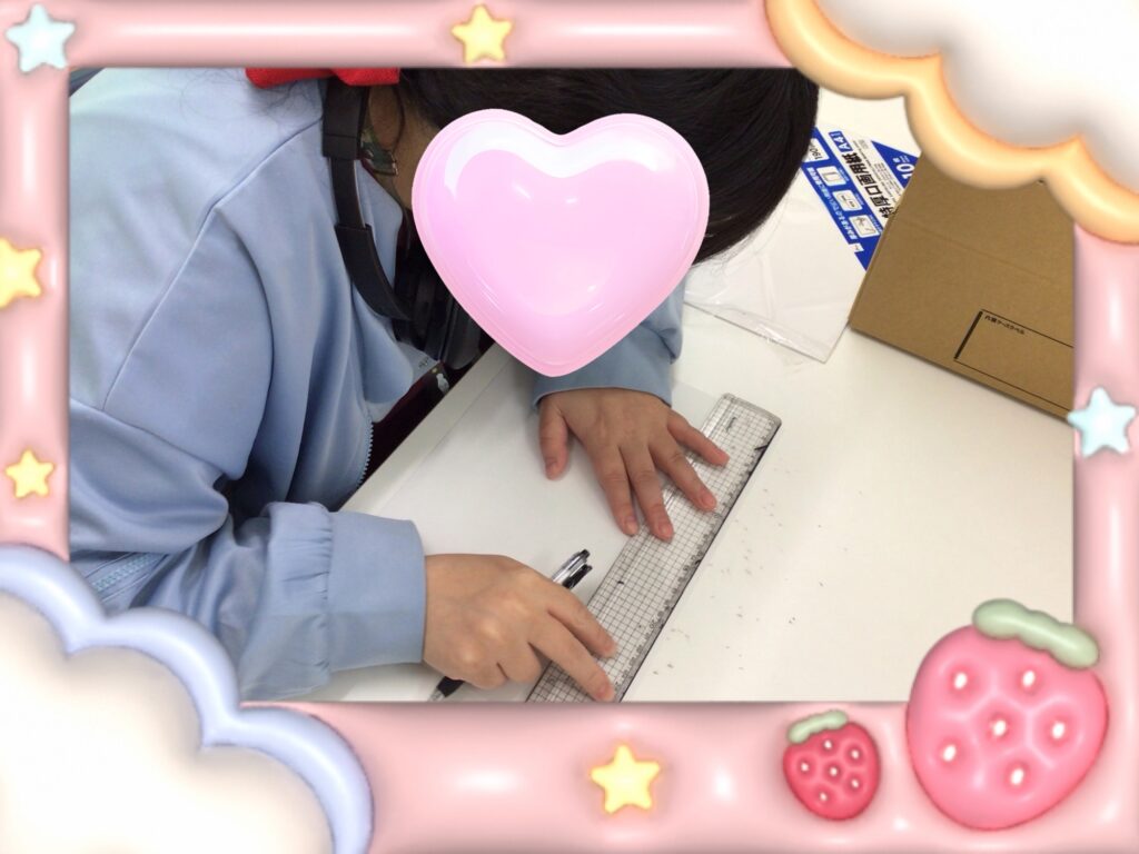 折り紙で折ったしおりに厚紙を入れたり穴を開けたりリボンを、つけたりして下さいました。
