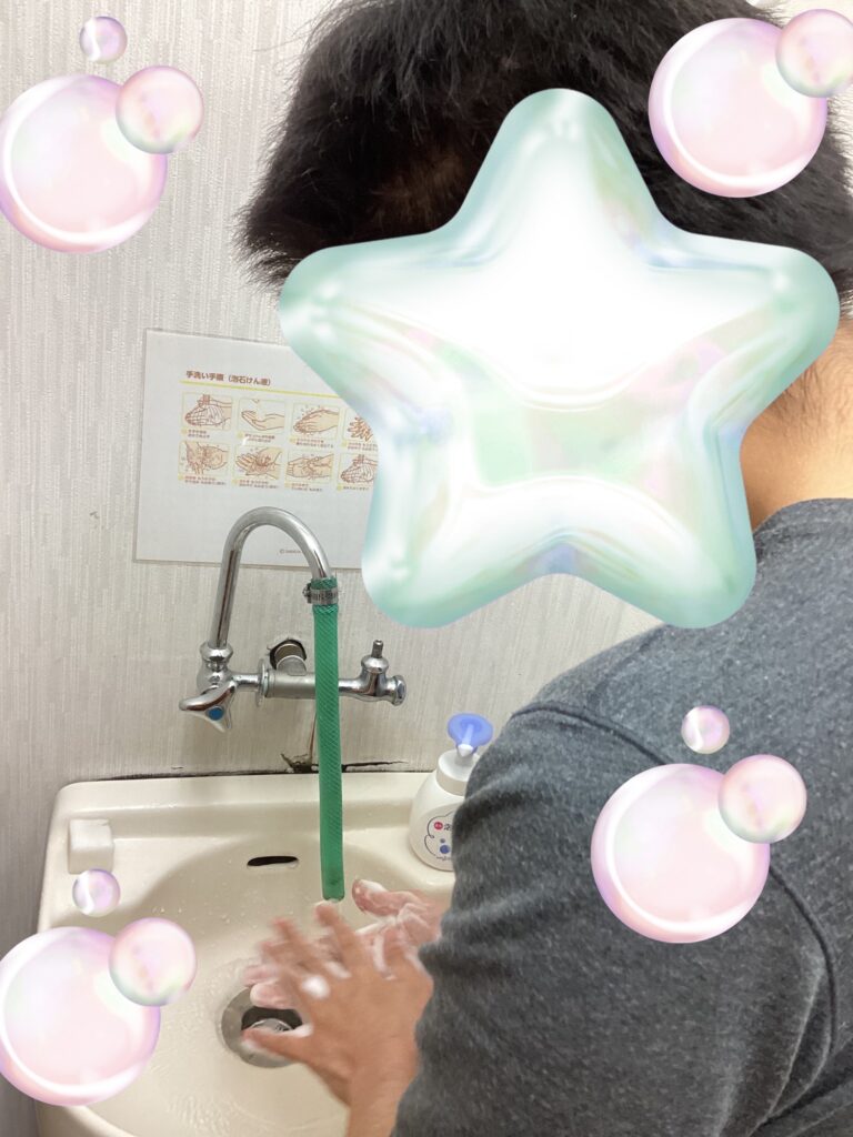手洗いをしています。泡を手の甲指のの間等もしっかり洗い、たっぷり水ですすぎきれいになりました