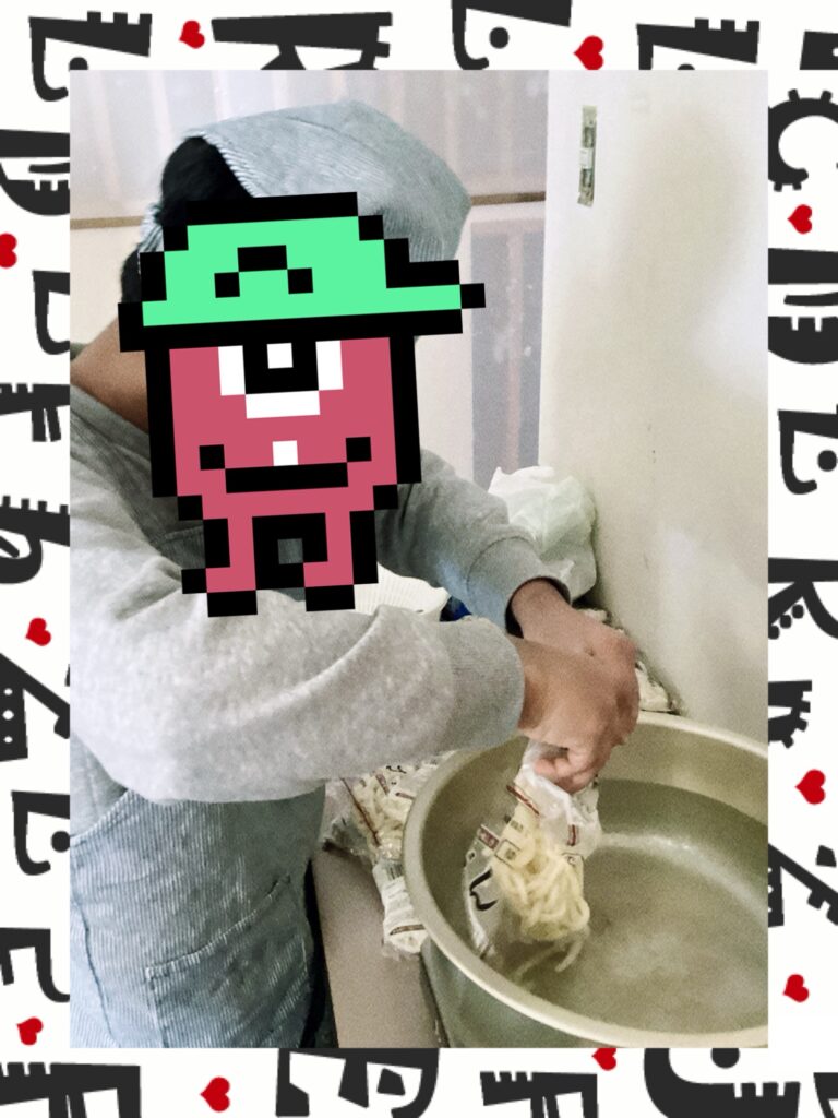 うどんを作りをしてます。うどんを袋から出しヤケドに気を付け次々入れてくれてます