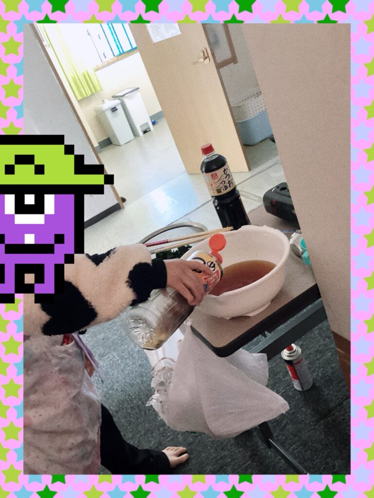 最後に味付けしてます。ボールにつゆを少しづつ入れ子供たちで美味しいおうどんを作る事ができました^ – ^