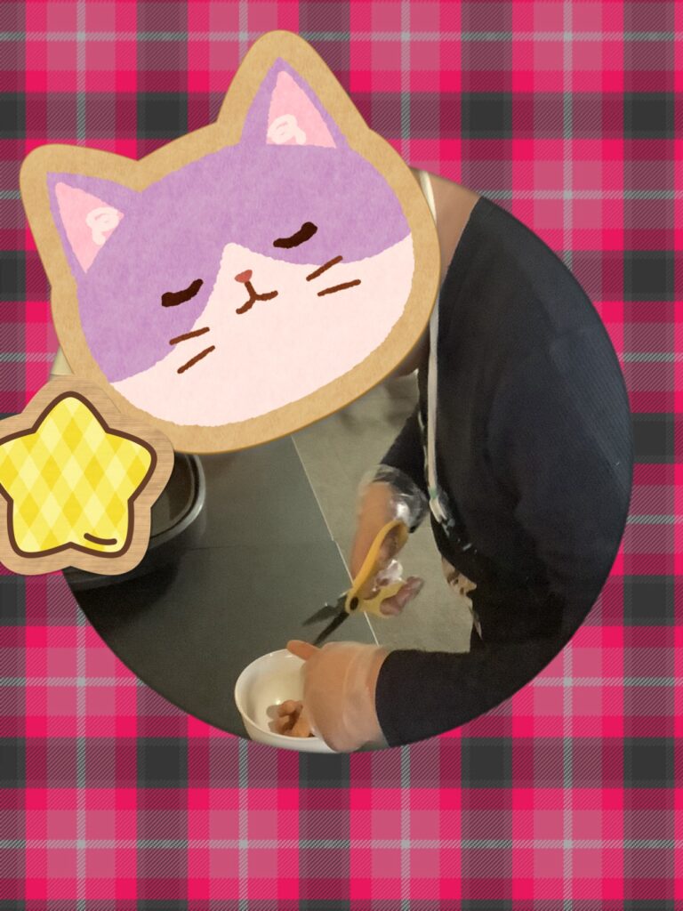 ハサミを使ってソーセージを一口サイズにカットしていきました。