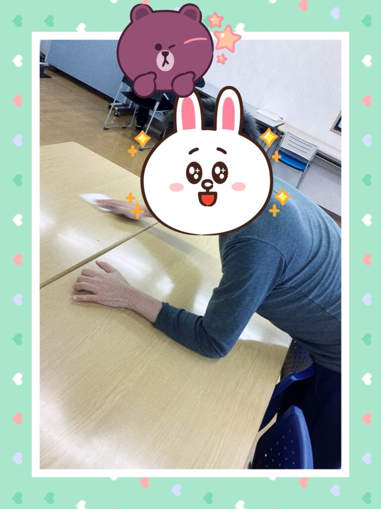 お昼を食べ終わった後机をアルコールペーパーで拭いてます。手を広げしっかりと拭いてツルツルになりました^ – ^