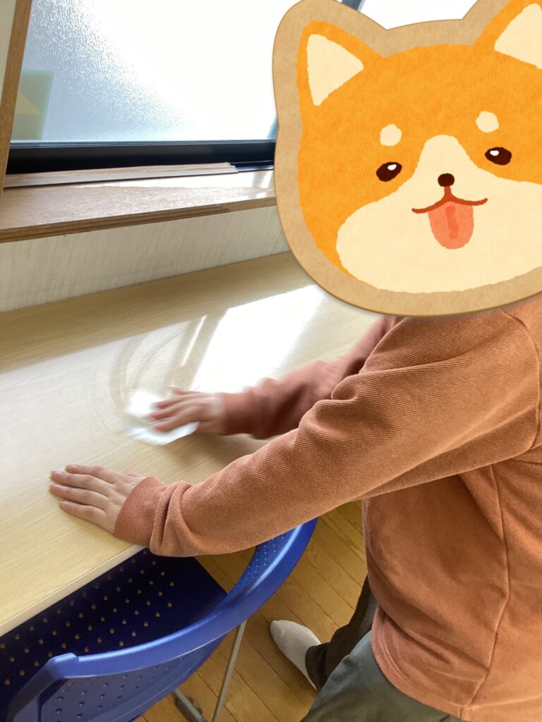 手洗いをした後にはいつも使う机の消毒も行い、利用者さんが丁寧に机の汚れや菌を拭いて下さいました。