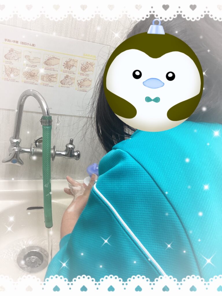 手洗いを行なっています。泡で手擦ったり、指の間などまんべんなく洗いあげることができました。