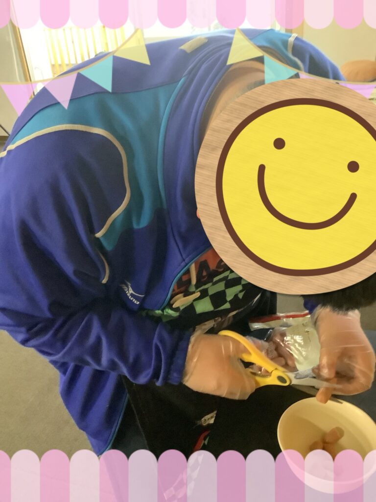 ハサミを使うためスタッフの見守りのもと安全第一で行いました。