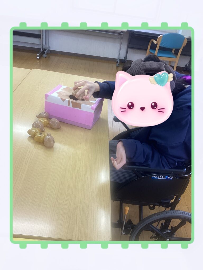 指先と手の力をつける訓練をしてます。ボールを箱の中に入れてゆきます。その訓練を何回も頑張りました!!