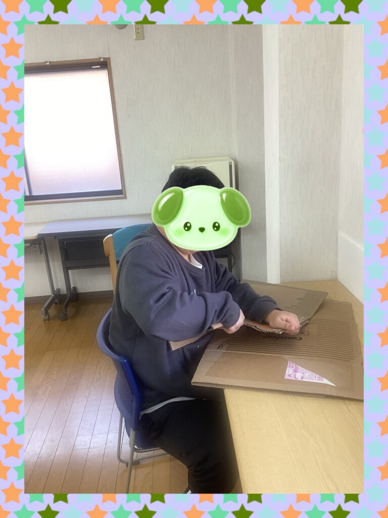 お手伝いをしてます。固く千切る事が大変なダンボールを力強く・いい音を響かせダンボール千切りをしてスタッフを手伝ってくれました☆