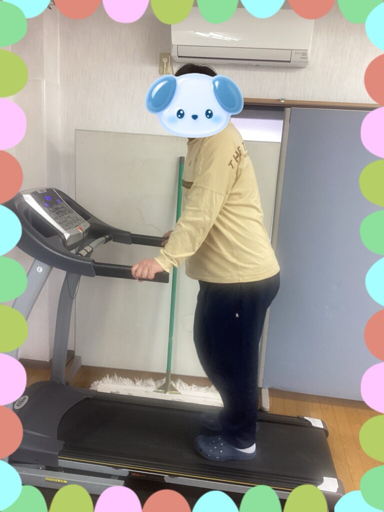 ランニングマシンで筋力トレーニングに取り組んでいます。スタッフの歌を聞きそれに合わせ足取りよく進んでいました^ – ^