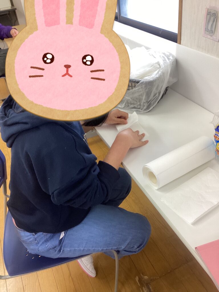 手洗いや机を拭いて清潔に保つため、キッチンペーパーを畳んで使いやすくしやすいように作業をしてくれる利用者さんもいました。