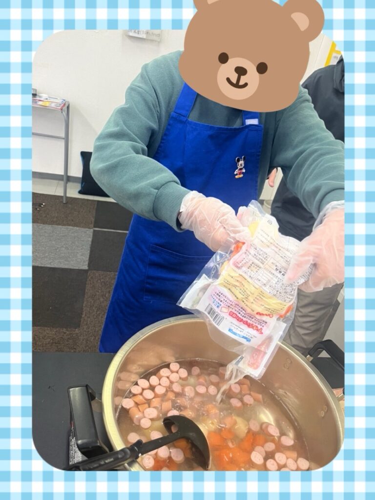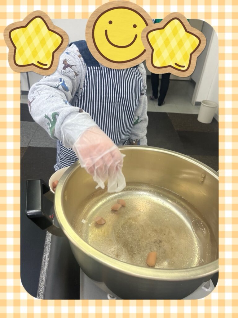 こちらも材料を入れてくれました。ウインナーを鍋に入れてくれました。熱いので気をつけて入れてくれました!