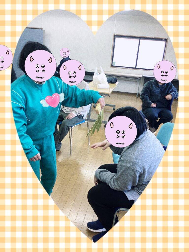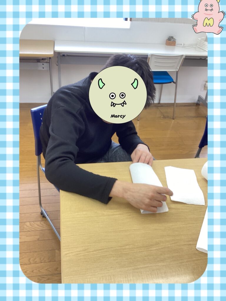 ペーパー折りの手伝いをしています。一人でペーパーを千切り折っていっていました。グッドです‼️