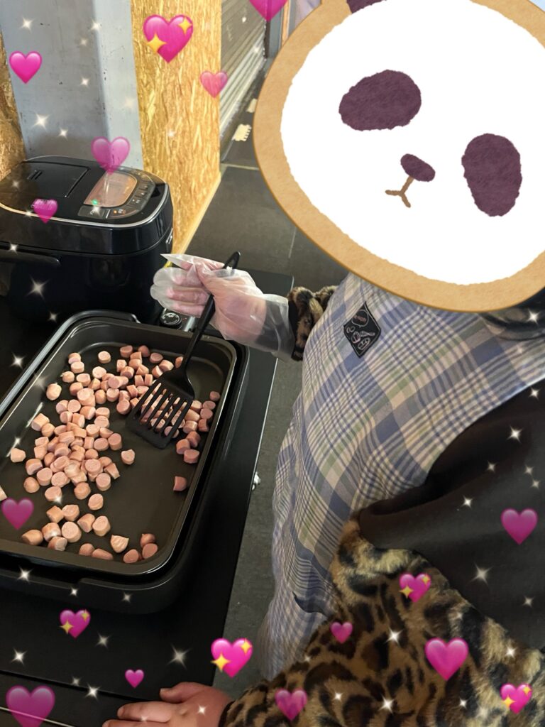 フライパンの中でジュージューと音を立てるソーセージに、「いいにおい!」と嬉しそうな声が上がりました。