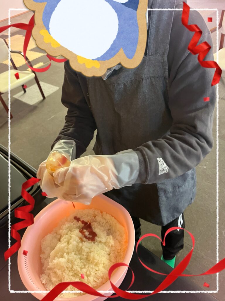 ご飯にケチャップを入れて混ぜたり、最後に上からかけたりと、それぞれ楽しみながら取り組みました。