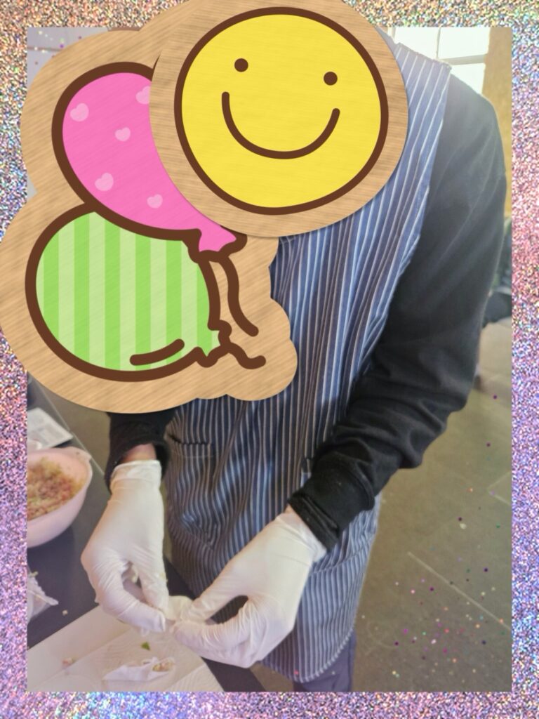 餃子の皮に具材をのせて、包む作業に挑戦しました。