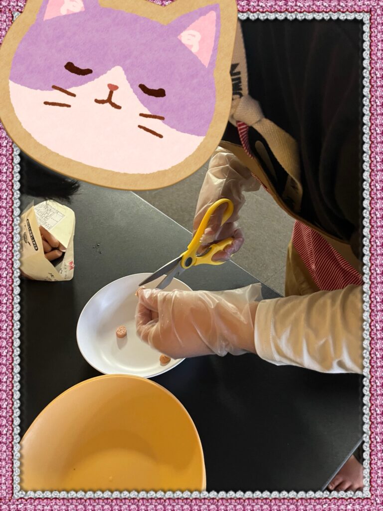 まずは、ソーセージをハサミで切るところからスタートです。