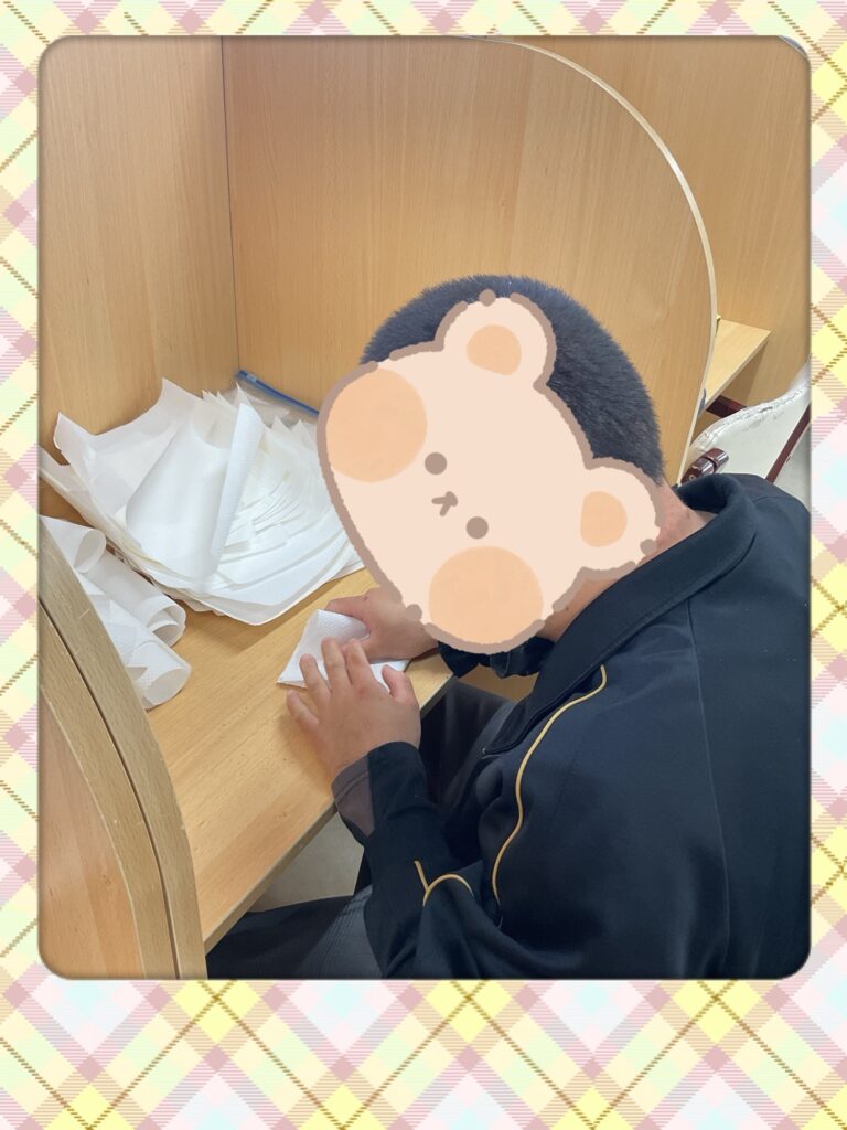 キッチンペーパーを折りる作業をしました。