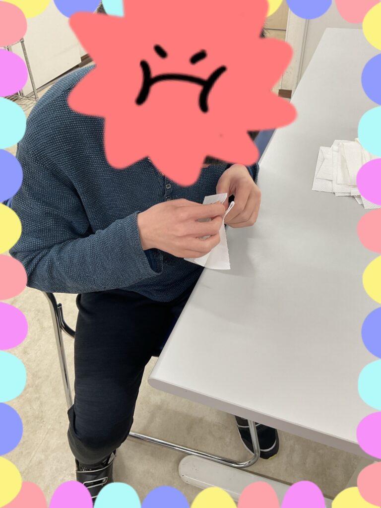 キッチンペーパを折りる作業をしました。