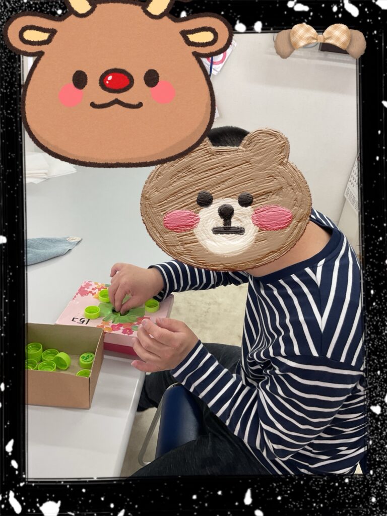 ペットボトルの蓋を箱に入れる作業をしました。