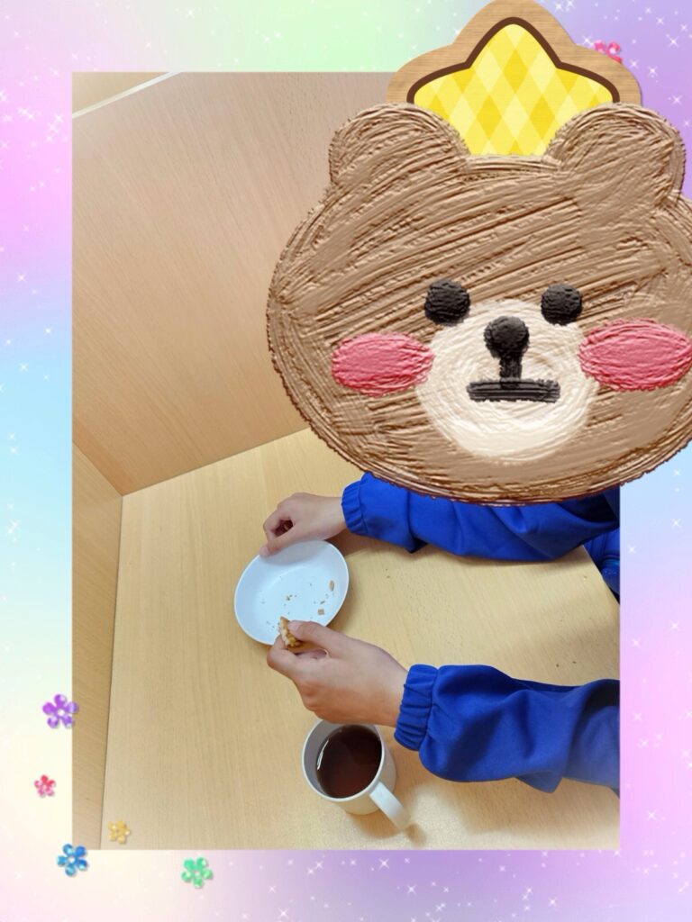 「今日のおやつ美味しいね!」と会話も弾みます。頑張った後の甘いものは、体だけでなく心も元気にしてくれますね!